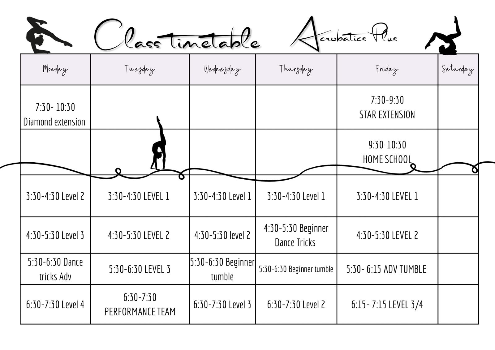 For intermediate level students generally 8+. Continuing to work on strength and flexibility. Learning walkovers, aerials and basic tumbling skills.