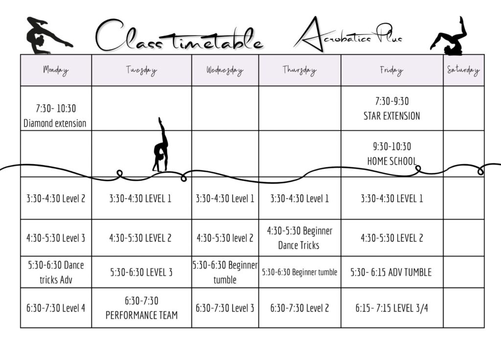 For intermediate level students generally 8+. Continuing to work on strength and flexibility. Learning walkovers, aerials and basic tumbling skills.